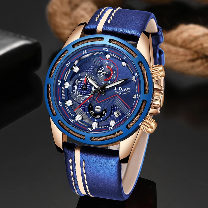 New LIGE Mens Watches Top Brand Luxury Blue Military Sport Watch Men Leather Waterproof Clock Quartz Wishwatch Relogio Masculino